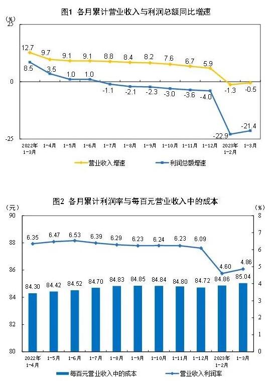 4月27日,國家統計局發布2023年1—3月份全國規模以上工業企業利潤情況。1—3月份,全國規模以上工業企業實現利潤總額15167.4億元,同比下降21.4%(按可比口徑計算)。 1—3月份,規模以上工業企業中,國有控股企業實現利潤總額5892.4億元,同比下降16.9%;股份制企業實現利潤總額11290.3億元,下降20.6%;外商及港澳臺商投資企業實現利潤總額3318.1億元,下降24.9%;私營企業實現利潤總額3894.1億元,下降23.0%。 1—3月份,采礦業實現利潤總額3604.5億元,同比下降5.8%;制造業實現利潤總額10207.6億元,下降29.4%;電力、熱力、燃氣及水生產和供應業實現利潤總額1355.4億元,增長33.2%。