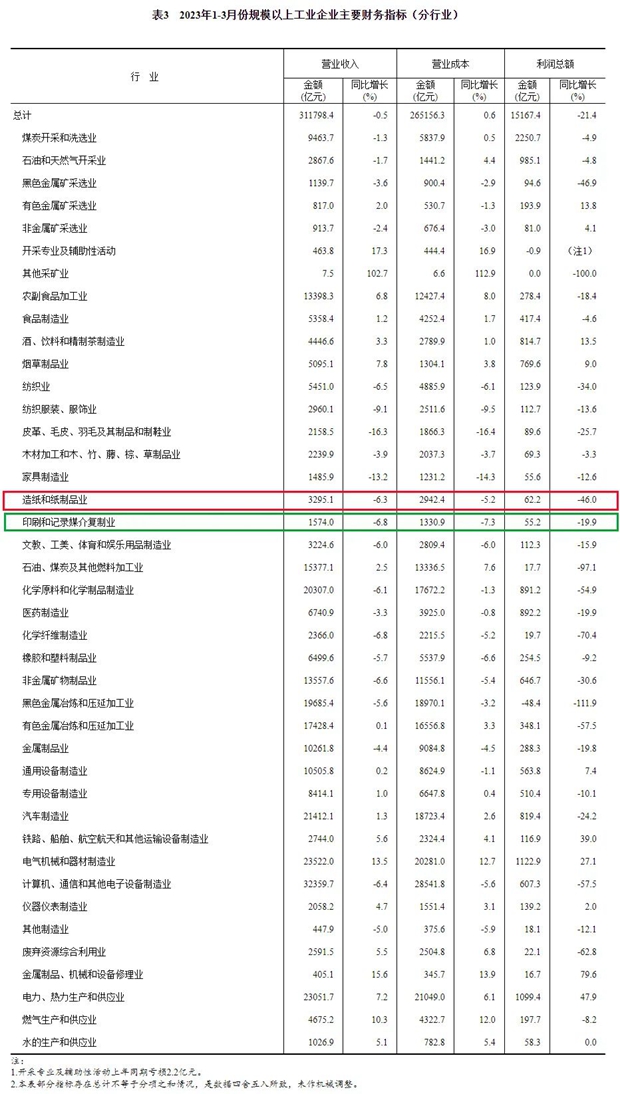 1—3月份,在41個工業大類行業中,10個行業利潤總額同比增長,1個行業持平,1個行業減虧,28個行業下降,1個行業由盈轉虧。主要行業利潤情況如下:電力、熱力生產和供應業利潤總額同比增長47.9%,電氣機械和器材制造業增長27.1%,通用設備制造業增長7.4%,石油和天然氣開采業下降4.8%,煤炭開采和洗選業下降4.9%,專用設備制造業下降10.1%,農副食品加工業下降18.4%,汽車制造業下降24.2%,非金屬礦物制品業下降30.6%,紡織業下降34.0%,化學原料和化學制品制造業下降54.9%,計算機、通信和其他電子設備制造業下降57.5%,有色金屬冶煉和壓延加工業下降57.5%,石油、煤炭及其他燃料加工業下降97.1%,黑色金屬冶煉和壓延加工業由盈利轉為虧損。 值得關注的是,造紙和紙制品業實現利潤總額62.2億元,同比下降46.0%;印刷和記錄媒介復制業實現利潤總額55.2億元,同比下降19.9%。