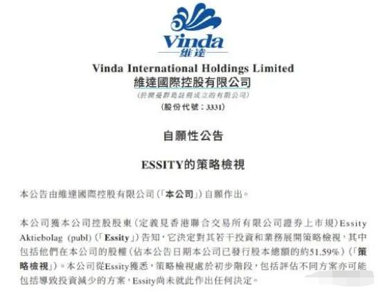 近日,維達國際(03331.HK)的控股股東瑞典Essity AB(愛適瑞)公布,正考慮出售維達大部分股份,據(jù)稱Essity正在討論出售部分或手上全部51.59%的維達股權(quán)。 Essity于4月26日宣布為達至長期價值創(chuàng)造,正啟動策略性檢討手上的維達持股及歐洲的私人品牌消費性紙巾業(yè)務(wù),藉此尋求不同選擇,結(jié)果可能導(dǎo)致出售有關(guān)項目,但目前未有最終決定。公司是次檢討,旨在減低消費類紙巾業(yè)務(wù)占比。
