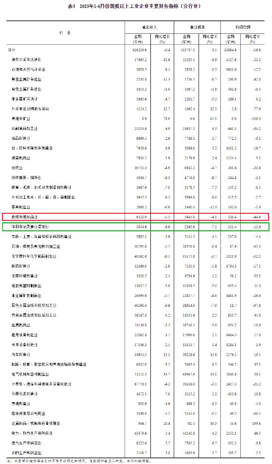 1—6月份,在41個工業大類行業中,12個行業利潤總額同比增長,29個行業下降。主要行業利潤情況如下:電力、熱力生產和供應業利潤總額同比增長46.5%,電氣機械和器材制造業增長29.1%,通用設備制造業增長17.9%,汽車制造業增長10.1%,專用設備制造業增長3.9%,石油和天然氣開采業下降12.2%,煤炭開采和洗選業下降23.3%,紡織業下降23.8%,計算機、通信和其他電子設備制造業下降25.2%,非金屬礦物制品業下降26.6%,農副食品加工業下降33.2%,有色金屬冶煉和壓延加工業下降44.0%,化學原料和化學制品制造業下降52.2%,石油、煤炭及其他燃料加工業下降92.3%,黑色金屬冶煉和壓延加工業下降97.6%。 值得關注的是,造紙和紙制品業實現利潤總額120.4億元,同比下降44.6%;印刷和記錄媒介復制業實現利潤總額131.4億元,同比下降13.6%。