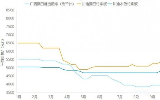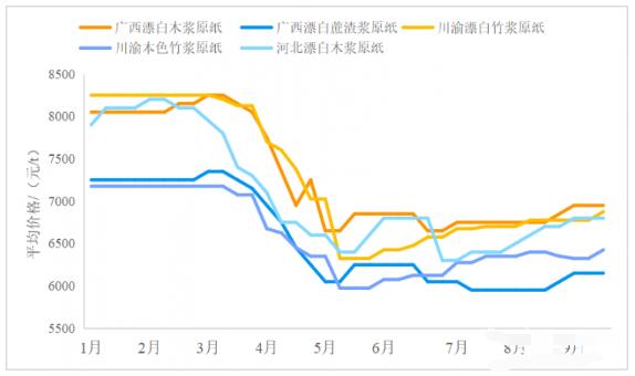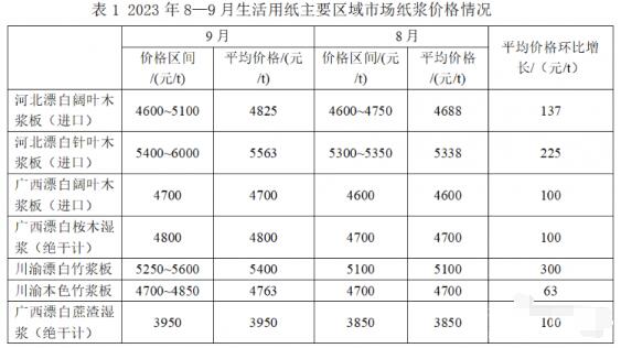 圖2 2023年1—9月川渝竹漿和廣西漂白蔗渣漿平均價(jià)格變化趨勢(shì) 從各類紙漿價(jià)格變化曲線,以及國(guó)內(nèi)市場(chǎng)目前紙漿的供應(yīng)情況來(lái)分析,木漿和非木漿價(jià)格變化存在一定的相關(guān)性。非木漿價(jià)格一定程度上受到木漿價(jià)格變化的影響,當(dāng)木漿價(jià)格上漲時(shí),非木漿也呈現(xiàn)不同程度的上漲,但值得注意的是,本色竹漿由于需求減少,2023年以來(lái)至今價(jià)格一直相對(duì)較為穩(wěn)定。 2023年9月,河北漂白闊葉木漿板(進(jìn)口)平均價(jià)格4825/t、河北漂白針葉木漿板(進(jìn)口)平均價(jià)格5563/t、廣西漂白闊葉木漿板(進(jìn)口)平均價(jià)格4700/t、廣西本地漂白桉木濕漿(絕干計(jì))平均價(jià)格約4800/t,較2023年8月均有所上漲。 非木漿中,川渝漂白竹漿平均價(jià)格約5400/t,較2023年8月(5100/t)上漲300/t;本色竹漿平均價(jià)格約4763/t,較2023年8月(4700/t)略有上漲。廣西漂白蔗渣濕漿(絕干計(jì))平均價(jià)格約3950/t,較2023年8月(3850/t)上漲100/t。具體變化情況見表1。 紙漿價(jià)格的波動(dòng)也對(duì)生活用紙?jiān)埖膬r(jià)格產(chǎn)生一定影響,原紙價(jià)格總體的變化趨勢(shì)與紙漿保持一致,但原紙價(jià)格的漲幅與紙漿價(jià)格漲幅并不完全一致,時(shí)間點(diǎn)也不完全同步,主要原因是國(guó)內(nèi)原紙產(chǎn)能相對(duì)過(guò)剩,市場(chǎng)競(jìng)爭(zhēng)激烈,原紙價(jià)格變化相對(duì)紙漿價(jià)格變化有一定的滯后。 同時(shí)具體影響程度還取決于多種因素,如企業(yè)產(chǎn)品定位、新產(chǎn)品開發(fā)、產(chǎn)品升級(jí)等。