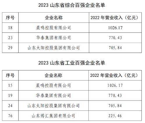 10月11日,山東省工業(yè)和信息化廳公示了2023山東省綜合百強企業(yè)名單、工業(yè)百強企業(yè)名單。晨鳴控股有限公司、華泰集團有限公司和山東太陽控股集團有限公司分別位列“2023山東省綜合百強企業(yè)”第18位、第23位和第29位。同時,3家企業(yè)和山東博匯集團有限公司上榜“2023山東省工業(yè)百強企業(yè)”,分別位列第15位、第19位、第24位和第76位。