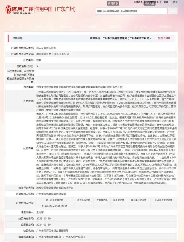 提交虛假資料取得公司登記 廣州粵成包裝制品有限公司被處罰