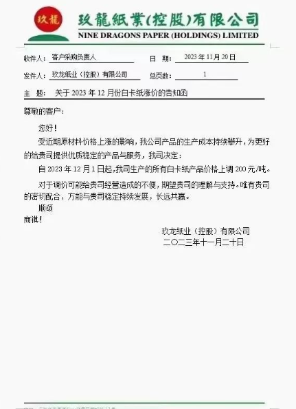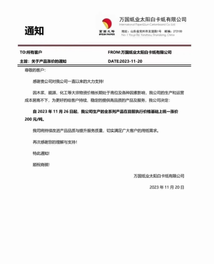 萬國紙業(yè)太陽白卡紙有限公司:自2023年11月26日起,我公司生產(chǎn)的全系列產(chǎn)品在目前執(zhí)行價格基礎(chǔ)上統(tǒng)一漲價200元/噸