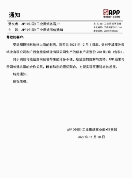 APP(中國)工業(yè)用紙事業(yè)部:受近期原物料價格上漲的影響,我司自2023年12月1日起針對寧波亞洲漿紙業(yè)有限公司和廣西金桂漿紙業(yè)有限公司生產(chǎn)的所有產(chǎn)品漲價200元/噸(含稅)