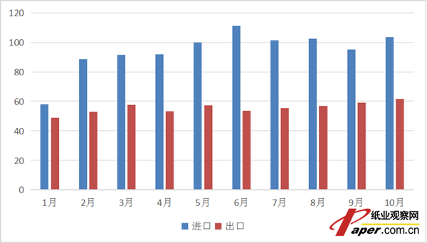 其中,10月份,我國機制紙及紙板當月進口量為103.48萬噸,與去年同期的71.07萬噸相比,增長45.61%。當月出口量為61.62萬噸,與去年同期的50.24萬噸相比,增長了22.66%。