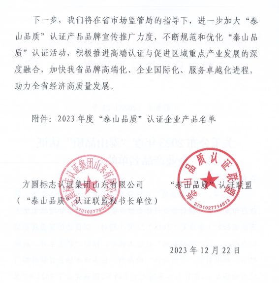 “泰山品質(zhì)”是指企業(yè)產(chǎn)品/服務(wù)擁有自主知識(shí)產(chǎn)權(quán),關(guān)鍵技術(shù)指標(biāo)達(dá)到國際先進(jìn)標(biāo)準(zhǔn)水平或高于國際、國家標(biāo)準(zhǔn)水平。只有在質(zhì)量、創(chuàng)新、品牌、標(biāo)準(zhǔn)、管理、綠色發(fā)展等方面具有行業(yè)引領(lǐng)性,取得了卓越績(jī)效,并具有持續(xù)滿足顧客需求的能力,才能夠代表山東制造、山東服務(wù)、山東建造、山東標(biāo)準(zhǔn)、山東質(zhì)量、山東品牌形象。獲得“泰山品質(zhì)”產(chǎn)品認(rèn)證證書,將更有利于公司品牌價(jià)值的提升和高品質(zhì)形象的塑造,有力于提升企業(yè)的市場(chǎng)競(jìng)爭(zhēng)力。“泰山品質(zhì)”認(rèn)證標(biāo)準(zhǔn)高“含金量”足,對(duì)企業(yè)品牌提升意義重大。