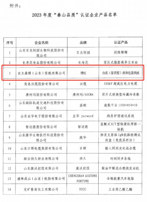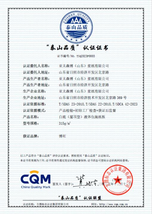 2023年12月22日,亞太森博(山東)漿紙有限公司生產(chǎn)的“博旺白底(屋頂型)液體包裝紙板”通過“泰山品質(zhì)”認(rèn)證,實(shí)現(xiàn)了經(jīng)開區(qū)“泰山品質(zhì)”認(rèn)證零的突破,也是今年日照市唯一一家通過該認(rèn)證企業(yè)。