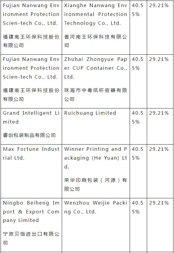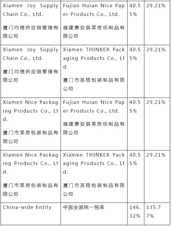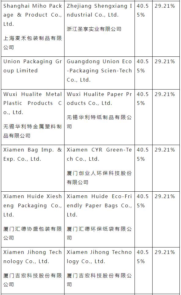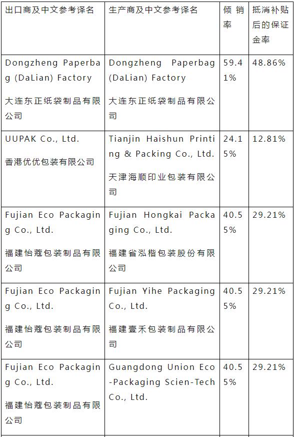 2023年12月28日,美國商務部宣布對進口自柬埔寨、中國大陸、哥倫比亞、印度、馬來西亞、葡萄牙、土耳其和越南8國及中國臺灣地區-的紙購物袋(PaperShoppingBags)作出反傾銷初裁,初步裁定柬埔寨生產商/出口商的傾銷率為10.05%~248.81%、中國大陸生產商/出口商的傾銷率為24.15%~146.32%(抵消補貼后的保證金調整為12.81%~135.77%),其中強制應訴企業DongzhengPaperbag(DaLian)Factory(大連東正紙袋制品有限公司)傾銷率為59.41%、UUPAKCo.,Ltd.(香港優優包裝有限公司)傾銷率為24.15%、獲得單獨稅率的企業傾銷率為40.55%、中國全國統一稅率146.32%(具體稅率詳見下表)、哥倫比亞生產商/出口商的傾銷率為9.48%~56.14%、印度生產商/出口商的傾銷率均為0.00%~57.87%(抵消補貼后的保證金調整為不適用~54.40%)、馬來西亞生產商/出口商的傾銷率為3.10%~112.22%、葡萄牙生產商/出口商的傾銷率為11.33%、土耳其生產商/出口商的傾銷率為26.32%~47.56%、越南生產商/出口商的傾銷率為51.25%~92.34%、中國臺灣地區生產商/出口商的傾銷率為0.00%~60.26%。美國商務部預計將于2024年3月11日對進口自馬來西亞和土耳其的涉案產品作出反傾銷終裁、于2024年5月10日對進口自其他國家和中國臺灣地區的涉案產品作出反傾銷終裁。本案涉及美國協調關稅稅號4819.30.0040和4819.40.0040項下產品。