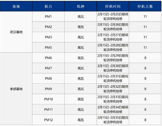 自2024年2月15日-2月25日期間,武漢金鳳凰紙業(yè)對11臺瓦楞紙機(jī)臺進(jìn)行輪流停機(jī)檢修安排,其中武漢基地4臺紙機(jī)停機(jī)時間11天,孝感基地7臺紙機(jī)停機(jī)時間8天。