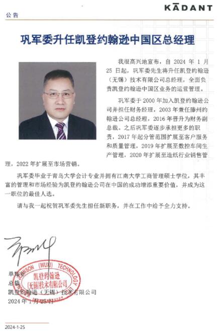自2024年1月25日起,鞏軍委先生將升任凱登約翰遜(無錫)技術有限公司總經(jīng)理,全面負責凱登約翰遜中國區(qū)業(yè)務的運營管理。