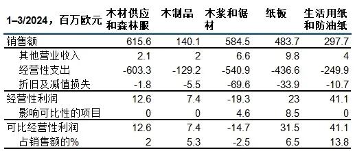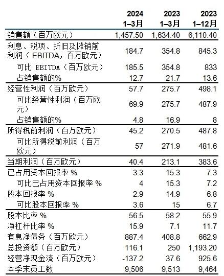 2024年1-3月(2023年1-3月同比數(shù)據(jù)) 銷售額為14.57億歐元(同比:16.34億歐元) 經(jīng)營性利潤為0.58億歐元(同比:2.76億歐元);可比經(jīng)營性利潤為0.7億歐元(2.76億歐元) 稅前利潤為0.45億歐元(同比:2.71億歐元);可比稅前利潤為0.57億歐元(同比:2.72億歐元) 可比已占用資本回報率為4.0%(同比:15.3%) 經(jīng)營性凈現(xiàn)金流為-1.37億歐元(同比:0.38億歐元) 2024年第一季度主要事件 相較于2023年第四季度,芬林集團(tuán)長纖漿在歐洲平均銷售價格有所上漲,在中國小幅下降。 歐洲及北美對商品漿需求上漲。中國市場需求平穩(wěn)向好。 市場對芬林集團(tuán)紙板產(chǎn)品的需求較2023年第四季度大幅增加。折疊紙板平均價格下降。 3月,芬林紙板做出決策,將不在芬蘭卡斯基寧(Kaskinen)投資興建紙板廠。 2024年3月11日至4月8日期間,在芬蘭發(fā)生的政治罷工導(dǎo)致貨物運輸及出口港口停擺。罷工對芬林集團(tuán)經(jīng)營利潤產(chǎn)生負(fù)面影響,13家工廠停工。 凱米生物制品廠蒸發(fā)車間發(fā)生的氣爆事故所導(dǎo)致的停工預(yù)計將持續(xù)至六月底。凱米紙板廠生產(chǎn)也將受其影響。 芬林生活用紙曼塔(Mänttä)工廠正在計劃實施一項為期五年、價值1億歐元的投資項目。 芬林集團(tuán)和安德里茨決定在芬蘭艾內(nèi)科斯基合作建造示范工廠,開發(fā)新的木質(zhì)素產(chǎn)品。 芬林集團(tuán)啟動建造Muoto包裝工廠的前期工程設(shè)計工作,以及建造Kuura紡織纖維工廠的預(yù)可行性研究。 2024年4-6月的業(yè)績預(yù)測 芬林集團(tuán)2024年4-6月的可比經(jīng)營性利潤預(yù)計將低于2024年1-3月。 1-3月回顧期結(jié)束后發(fā)生的事件 芬林芬寶梅里卡爾維亞鋸材廠于4月關(guān)廠。 4月,芬林紙板做出投資決策,投入約0.6億歐元用于辛佩萊(Simpele)折疊紙板廠的設(shè)備現(xiàn)代化改造。改造工程預(yù)計于2025年下半年完成。