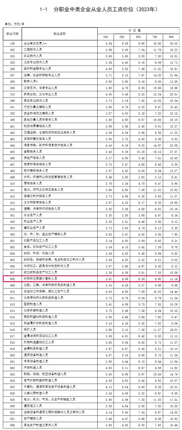 數據顯示,“印刷和記錄媒介復制人員”工資價位分別為3.81萬元(10分位)、4.88萬元(25分位)、6.24萬元(50分位)、8.60萬元(75分位)、11.16萬元(90分位)。
