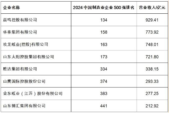 8家造紙企業(yè)入選2024中國(guó)制造業(yè)企業(yè)500強(qiáng)榜單,分別為晨鳴控股有限公司、華泰集團(tuán)有限公司、玖龍紙業(yè)(控股)有限公司、山東太陽(yáng)控股集團(tuán)有限公司、勝達(dá)集團(tuán)有限公司、山鷹國(guó)際控股股份公司、金東紙業(yè)(江蘇)股份有限公司、山東博匯集團(tuán)有限公司,具體排名情況見表1.