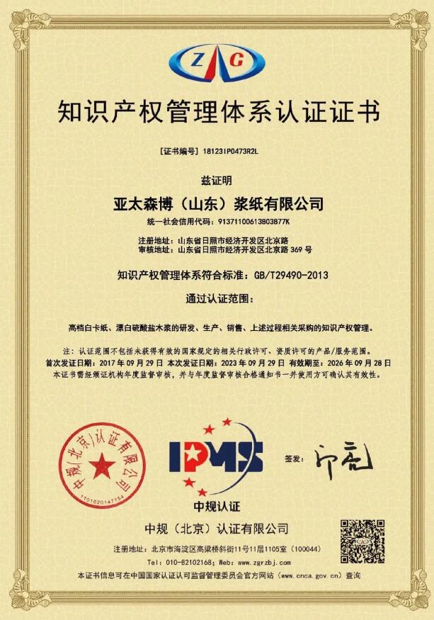 9月19日,亞太森博順利通過中規(guī)(北京)認(rèn)證有限公司知識(shí)產(chǎn)權(quán)管理體系監(jiān)督審核。中規(guī)北京認(rèn)證指出,我公司知識(shí)產(chǎn)權(quán)管理體系有效實(shí)施、運(yùn)行并持續(xù)改進(jìn),符合標(biāo)準(zhǔn)GB/T 29490-2013、體系文件和相關(guān)法律法規(guī)的要求,同時(shí)與企業(yè)經(jīng)營發(fā)展相適應(yīng)。