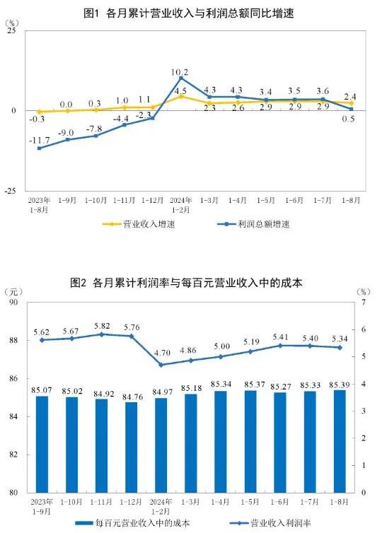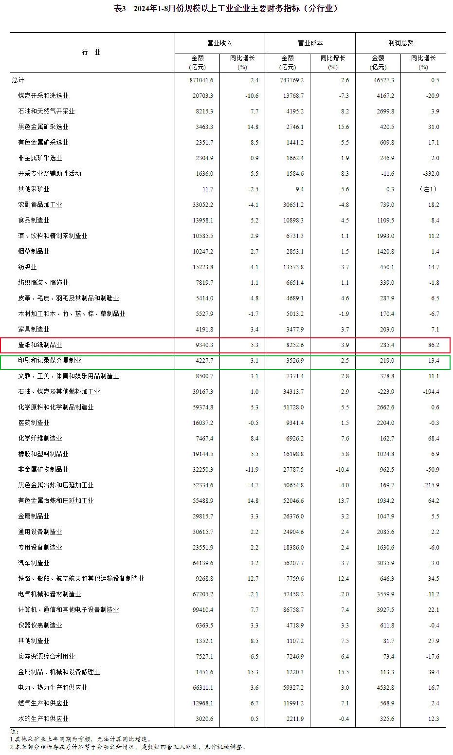 值得關注的是,造紙和紙制品業實現利潤總額285.4億元,同比增長86.2%;印刷和記錄媒介復制業實現利潤總額219.0億元,同比增長13.4%。 1—8月份,規模以上工業企業實現營業收入87.10萬億元,同比增長2.4%;發生營業成本74.38萬億元,增長2.6%;營業收入利潤率為5.34%,同比下降0.10個百分點。其中,造紙和紙制品業實現營業收入9340.3億元,同比增長5.3%;印刷和記錄媒介復制業實現營業收入4227.7億元,同比增長3.1%。 8月末,規模以上工業企業資產總計173.71萬億元,同比增長4.8%;負債合計100.11萬億元,增長4.6%;所有者權益合計73.60萬億元,增長5.2%;資產負債率為57.6%,同比下降0.2個百分點。 8月末,規模以上工業企業應收賬款25.50萬億元,同比增長8.4%;產成品存貨6.53萬億元,增長5.1%。 1—8月份,規模以上工業企業每百元營業收入中的成本為85.39元,同比增加0.19元;每百元營業收入中的費用為8.41元,同比增加0.04元。 8月末,規模以上工業企業每百元資產實現的營業收入為76.5元,同比減少2.4元;人均營業收入為180.0萬元,同比增加7.3萬元;產成品存貨周轉天數為20.4天,同比增加0.3天;應收賬款平均回收期為66.8天,同比增加3.7天。 受去年同期高基數等因素影響,8月份,規模以上工業企業利潤同比下降17.8%。 國家統計局工業司統計師于衛寧解讀工業企業利潤數據表示,受市場有效需求不足以及高溫、暴雨、洪澇等自然災害對部分地區沖擊較大等因素影響,加之8月份當月同期基數較7月份明顯抬高,1—8月份,規上工業企業利潤增速有所回落,但仍延續年初以來的增長態勢,以高技術制造業為代表的新動能行業保持較快增長,工業經濟高質量發展持續穩步推進。工業企業利潤和營業收入繼續保持增長、高技術制造業利潤持續快速增長、消費品制造業和裝備制造業利潤保持穩定增長。總體看,規上工業企業利潤延續增長態勢,工業新動能支撐作用彰顯,但同時也要看到,國內消費需求依然偏弱,外部環境復雜多變,工業企業效益恢復基礎仍需繼續鞏固。