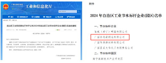 歲末年初,喜報盈門!近日,廣西金桂漿紙業有限公司分別獲得“2024年度自治區清潔生產企業”、“2024年度自治區企業技術中心評價優秀”、“2018-2022年度廣西‘守合同重信用企業’”、“2024年度自治區工業節水標桿企業”4項榮譽,迎來了2025年“開門紅”! 2024年度自治區清潔生產企業 2024年12月30日,廣西壯族自治區工業和信息化廳、生態環境廳、發展和改革委員會公布了2024年度自治區清潔生產企業名單的通知,廣西金桂漿紙業有限公司再度上榜。