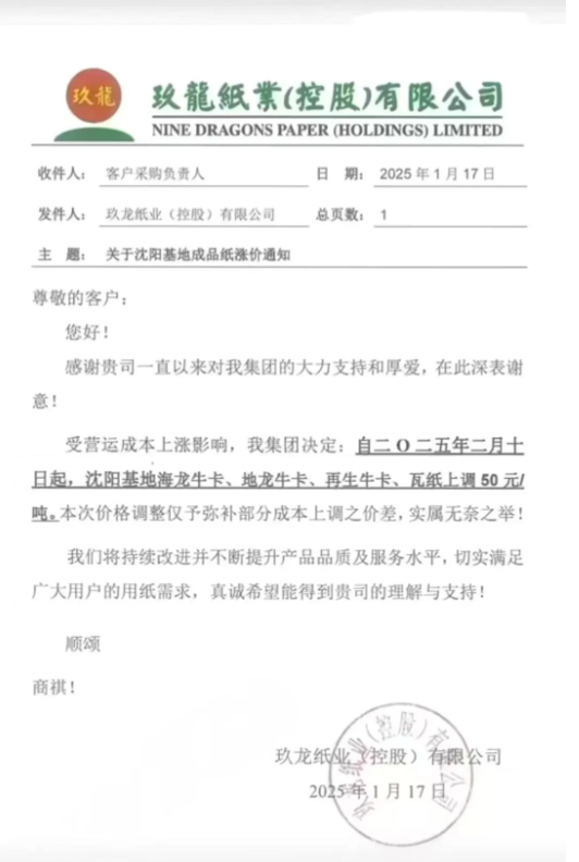 2025年1月17日,玖龍紙業(yè)位于北方的生產(chǎn)基地:天津、河北、沈陽(yáng)玖龍宣布,將從2月10日起對(duì)原紙漲價(jià),漲幅為50元/噸。具體如下↓