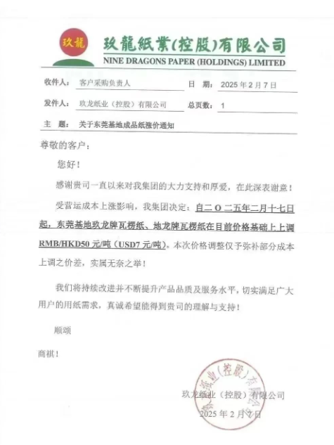 玖龍紙業宣布旗下基地繼續漲價,東莞基地自2月17日起,玖龍牌瓦楞紙、地龍牌瓦楞紙在目前價格基礎上上調RMB/HKD50元/噸(USD7元/噸)。