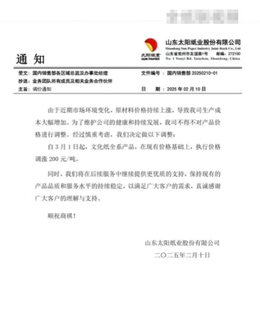 APP(中國)事業群·文化用紙內貿銷售:由于原輔材料價格持續高位運行,我司原紙成本居高不下,為緩解營運壓力并為客戶穩定提供高品質的紙品和服務,我司決定自2025年3月1日起,針對金東、金海所生產的銅版、非涂全系各紙種、克重紙品價格在 2025年2月基礎上調漲200 元/噸(含稅)。