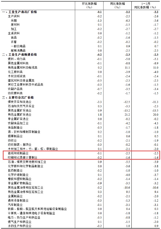 2月份,工業生產者出廠價格中,生產資料價格下降2.5%,影響工業生產者出廠價格總水平下降約1.86個百分點。生活資料價格下降1.2%,影響工業生產者出廠價格總水平下降約0.31個百分點。