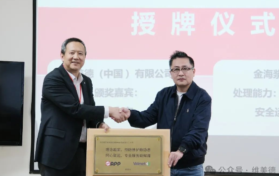 圖:維美德中國區(qū)總裁朱向東(左)與金海漿紙總經(jīng)理孟祥巖(右) RB1運行情況分享:預(yù)防性維護,保障穩(wěn)定運行 金海漿紙堿回收部經(jīng)理張剛平詳細分享了堿爐RB1二十年來的運行情況。他表示,堿爐RB1自投產(chǎn)以來,始終保持穩(wěn)定運行,各項指標(biāo)均優(yōu)于設(shè)計值,為漿紙生產(chǎn)提供了堅實保障。金海漿紙工務(wù)部機械處處長張奎表示,這一成就得益于金海漿紙“預(yù)防性維護”的管理理念,以及維美德提供的專業(yè)服務(wù)支持。金海漿紙團隊通過嚴(yán)格的預(yù)防性維護計劃,定期檢查設(shè)備關(guān)鍵部件,并結(jié)合維美德“供貨加人加技術(shù)服務(wù)”的模式,及時排除了潛在隱患。 孟祥巖特別提到,維美德徐玲、董成忠?guī)ьI(lǐng)的技術(shù)服務(wù)團隊在堿爐年度檢修期間深入現(xiàn)場提供專業(yè)檢查服務(wù),及時發(fā)現(xiàn)并科學(xué)分析問題,制定專業(yè)方案,讓他們感受到維美德的專業(yè)性和服務(wù)價值。這種強調(diào)科學(xué)和數(shù)據(jù)支持的“硬實力”和全生命周期服務(wù)的模式,確保了設(shè)備的長期穩(wěn)定運行。 發(fā)展規(guī)劃與反饋:同心致遠,邁向新高度 孟祥巖向維美德團隊介紹了公司未來的發(fā)展規(guī)劃。他表示,作為全球領(lǐng)先的林漿紙一體化綠色循環(huán)企業(yè),金海漿紙始終秉承“節(jié)能減碳,綠色發(fā)展”的可持續(xù)發(fā)展理念,將繼續(xù)推進林漿紙一體化發(fā)展戰(zhàn)略,在節(jié)能減碳和數(shù)字化智能化領(lǐng)域持續(xù)投入與創(chuàng)新,推動行業(yè)綠色轉(zhuǎn)型。 同時,他對維美德團隊的支持表示感謝:“維美德的技術(shù)和服務(wù)始終是我們信賴的保障。未來,我們期待與維美德繼續(xù)攜手,共同應(yīng)對行業(yè)挑戰(zhàn),邁向新的高度。” 維美德中國區(qū)漿線和能源工廠優(yōu)化總監(jiān)嚴(yán)桂榮表示:“我們將繼續(xù)以客戶為中心,以深度交流和定制化的合作模式,提供量身定制的解決方案,幫助金海漿紙解決當(dāng)前問題,預(yù)防潛在故障,為金海漿紙創(chuàng)造更大的價值和保障。” 授牌儀式與合影:紀(jì)念輝煌時刻 在雙方的熱烈掌聲中,授牌儀式正式舉行。朱向東代表維美德向金海漿紙孟祥巖頒發(fā)了題有 “熱烈祝賀金海漿紙堿爐RB1穩(wěn)定運行二十年”的牌匾。牌匾上還特別注明: 理念超前,預(yù)防維護除隱患; 同心致遠,專業(yè)服務(wù)助輝煌。 授牌儀式后,雙方團隊在金海漿紙合影留念,共同記錄下這一值得紀(jì)念的時刻。此外,維美德團隊在金海漿紙總經(jīng)理辦公室經(jīng)理祝金俠的講解下參觀了企業(yè)展廳,并對金海漿紙在制漿造紙領(lǐng)域的卓越表現(xiàn)表示由衷的欽佩。