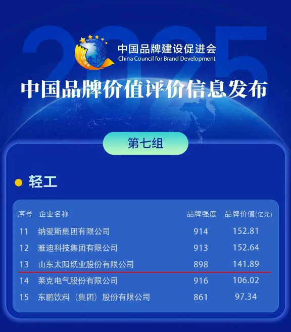 5月10日,由中國品牌建設促進會、中國資產評估協會主辦,新華社品牌工作辦公室、《中國品牌》雜志社等單位承辦的“2025中國品牌價值評價信息”在浙江德清正式發布。其中,山東太陽紙業股份有限公司品牌價值為141.89億元,品牌強度為898,品牌價值再創新高,位列輕工組第13位。