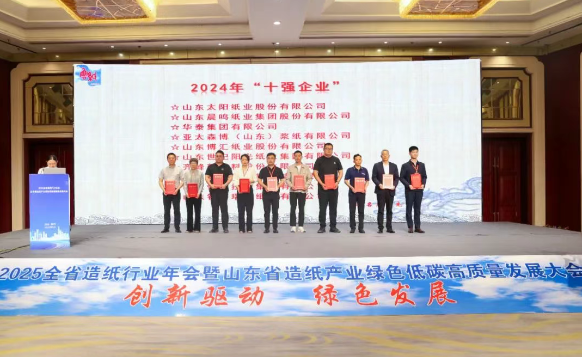 2025年5月8日-9日,以“創新驅動、綠色發展”為主題的“2025山東省造紙行業年會暨山東省造紙產業綠色低碳高質量發展大會”在山東德州成功召開。會上,中國造紙協會副理事長、山東省造紙行業協會專職副會長趙振東宣讀了《山東協會認定“雙十”標桿企業——山東省造紙行業協會“2024年‘十強企業’‘十佳企業’”通報》,其中,山東太陽紙業股份有限公司被認定為“2024年‘十強企業’”。
