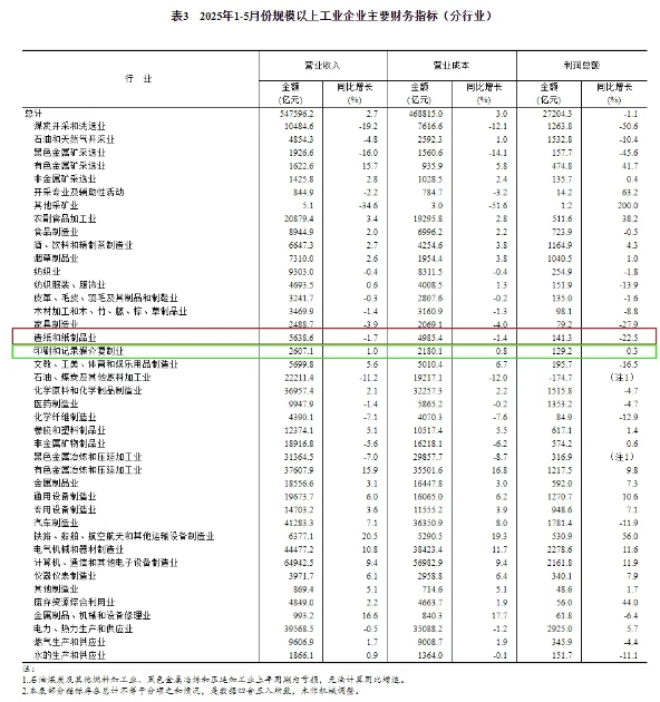 2025年1-5月全國規上造紙和紙制品利潤總額141.3億元,同比下降22.5%