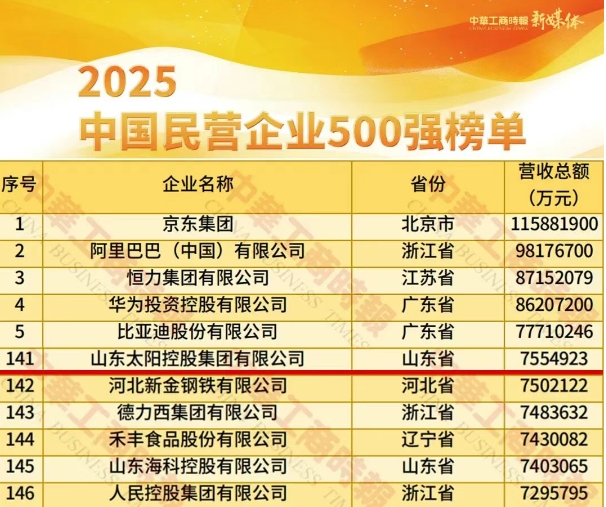 8月28日,2025中國民營企業(yè)500強發(fā)布會暨全國優(yōu)強民企助力遼寧全面振興新突破大會在遼寧召開,會上發(fā)布了“2025中國民營企業(yè)500強”“2025中國制造業(yè)民營企業(yè)500強”等榜單。其中,公司控股股東山東太陽控股集團有限公司榮列“2025中國民營企業(yè)500強”第141位,榮列“2025中國制造業(yè)民營企業(yè)500強”第101位,排名均實現(xiàn)穩(wěn)步提升,企業(yè)的發(fā)展質(zhì)量、效益和核心競爭力顯著增強,高質(zhì)量發(fā)展邁上新臺階。