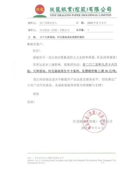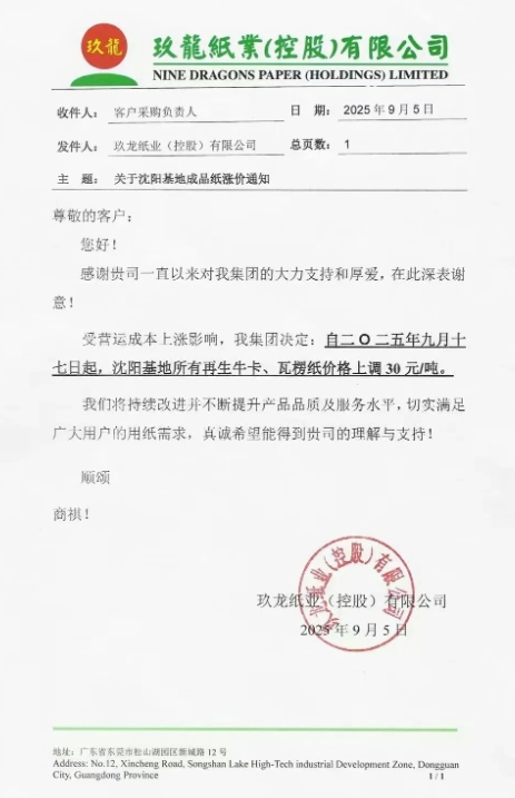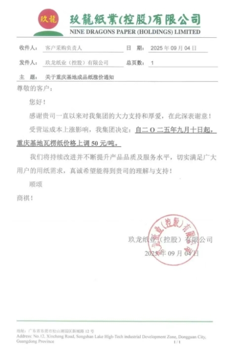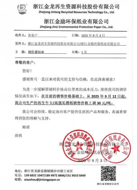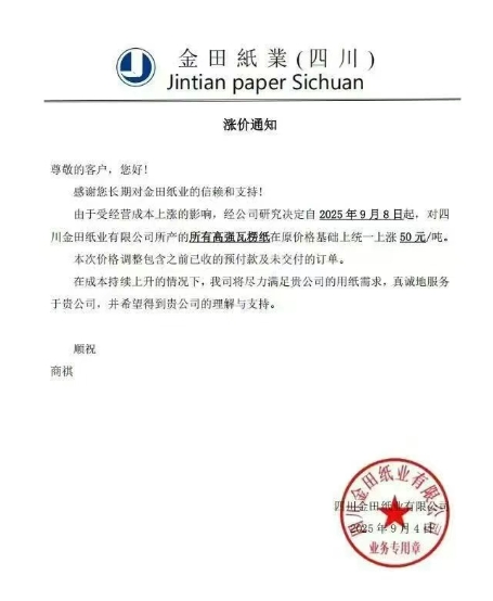 自2025年9月8日起,對四川金田紙業(yè)有限公司所產(chǎn)的所有高強(qiáng)瓦楞紙?jiān)谠瓋r(jià)格基礎(chǔ)上統(tǒng)一上漲50元/噸。