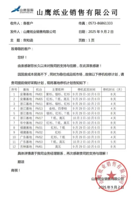 • 山鷹紙業(yè)停機(jī)計(jì)劃