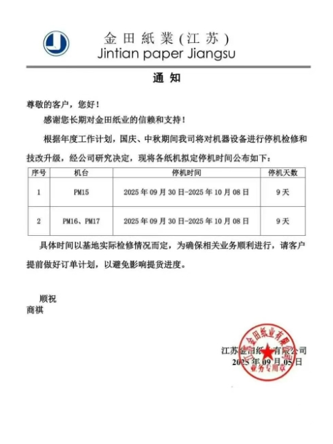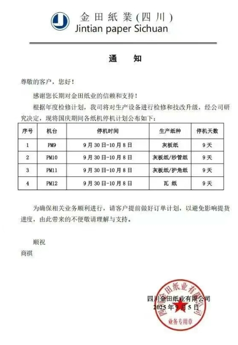 • 四川金田紙業(yè)調(diào)價(jià)通知及停機(jī)計(jì)劃