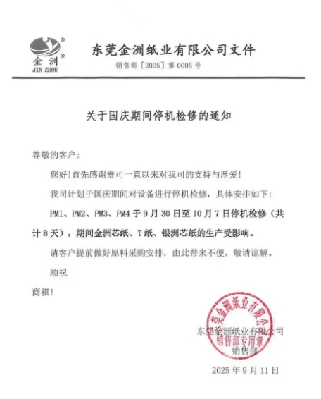 •淄博永豐環保科技有限公司 自2025年9月13日起,瓦楞紙、環保紙、牛卡紙價格在原有價格基礎上上調30元。 •山東仁豐特種材料股份有限公司 自2025年9月13日開始,瓦楞紙在原有價格基礎上上調30元/噸。 •玖龍紙業東莞基地 自九月十八日起,東莞基地地龍再生牛卡、江龍再生牛卡、玖龍瓦楞紙、地龍瓦楞紙上調RMB/HKD30元/噸(USD4元/噸)。 •浙江金龍再生資源科技股份有限公司、浙江金勵環保紙業有限公司 在目前的銷售價格基礎上,從2025年9月15日起,我公司生產的再生牛卡/高強瓦楞紙銷售價格上調30元/噸。 •上海珀菲特包裝科技有限公司 從2025年9月11日17:00時起,所有紙板訂單在原價格的基礎上上調3%。 •上海瑞邦紙品包裝有限公司 自2025年09月12日08:00起,所有紙板訂單價格在原有基礎上上調3%(包括多層紙板,二層紙板)。 •上海勇玖包裝材料有限公司 從2025年9月11日16:00時對所有客戶所下訂單價格上漲3%。 •山鷹紙業 自2025年9月13日起,在原有價格基礎上: 廣東基地:T紙、瓦紙上調30元/噸; 自2025年9月15日起,在原有價格基礎上: 福建基地:紅杉系、瓦紙系上調50元/噸; •五洲特紙 從2025年9月18日起,針對集團旗下包裝紙系列產品在現有價格基礎上,上調30元/噸。 •金田紙業(東莞) 自2025年09月15日起,對東莞市金田紙業有限公司所產的金泊牌再生牛卡紙、金泊牌高強瓦楞紙在原價格基礎上統一上漲30元/噸。 •金田紙業(四川) 自2025年9月16日起,對四川金田紙業有限公司所產的所有高強瓦楞紙在原價格基礎上統一上漲30元/噸。 •玖龍紙業太倉基地 自九月十八日起,瓦紙/Y紙/B紙/E紙/T紙在目前價格的基礎上上調RMB30元/噸。 造紙廠國慶停機計劃 •東莞金洲紙業有限公司