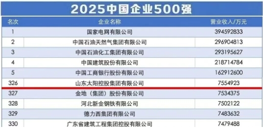 9月15日,中國企業(yè)聯(lián)合會、中國企業(yè)家協(xié)會在京召開新聞發(fā)布會,發(fā)布“2025中國企業(yè)500強(qiáng)”榜單。其中,公司控股股東山東太陽控股集團(tuán)有限公司憑借穩(wěn)健的經(jīng)營表現(xiàn)和卓越的綜合實(shí)力榮耀登榜,位列第326位,較去年提升10位!