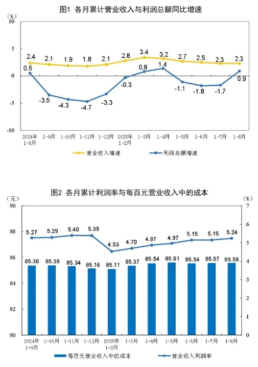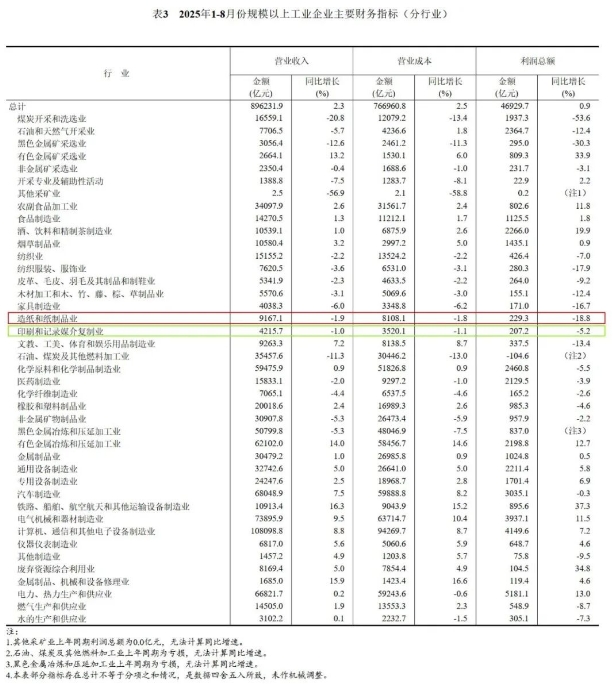 1—8月份,規(guī)模以上工業(yè)企業(yè)實(shí)現(xiàn)營(yíng)業(yè)收入89.62萬(wàn)億元,同比增長(zhǎng)2.3%;發(fā)生營(yíng)業(yè)成本76.70萬(wàn)億元,增長(zhǎng)2.5%;營(yíng)業(yè)收入利潤(rùn)率為5.24%,同比下降0.06個(gè)百分點(diǎn)。其中,造紙和紙制品業(yè)實(shí)現(xiàn)營(yíng)業(yè)收入9167.1億元,同比下降1.9%;印刷和記錄媒介復(fù)制業(yè)實(shí)現(xiàn)營(yíng)業(yè)收入4215.7億元,同比下降1.0%。 8月末,規(guī)模以上工業(yè)企業(yè)資產(chǎn)總計(jì)185.08萬(wàn)億元,同比增長(zhǎng)5.0%;負(fù)債合計(jì)107.34萬(wàn)億元,增長(zhǎng)5.4%;所有者權(quán)益合計(jì)77.73萬(wàn)億元,增長(zhǎng)4.4%;資產(chǎn)負(fù)債率為58.0%,同比上升0.2個(gè)百分點(diǎn)。 8月末,規(guī)模以上工業(yè)企業(yè)應(yīng)收賬款27.24萬(wàn)億元,同比增長(zhǎng)6.6%;產(chǎn)成品存貨6.73萬(wàn)億元,增長(zhǎng)2.3%。 1—8月份,規(guī)模以上工業(yè)企業(yè)每百元營(yíng)業(yè)收入中的成本為85.58元,同比增加0.19元;每百元營(yíng)業(yè)收入中的費(fèi)用為8.37元,同比減少0.08元。 8月末,規(guī)模以上工業(yè)企業(yè)每百元資產(chǎn)實(shí)現(xiàn)的營(yíng)業(yè)收入為74.0元,同比減少2.0元;人均營(yíng)業(yè)收入為183.5萬(wàn)元,同比增加5.7萬(wàn)元;產(chǎn)成品存貨周轉(zhuǎn)天數(shù)為20.5天,同比增加0.1天;應(yīng)收賬款平均回收期為70.1天,同比增加3.7天。 8月份,規(guī)模以上工業(yè)企業(yè)利潤(rùn)同比由上月下降1.5%轉(zhuǎn)為增長(zhǎng)20.4%。 國(guó)家統(tǒng)計(jì)局工業(yè)司首席統(tǒng)計(jì)師于衛(wèi)寧解讀2025年1—8月份工業(yè)企業(yè)利潤(rùn)數(shù)據(jù)表示,1—8月份,在宏觀政策發(fā)力顯效、全國(guó)統(tǒng)一大市場(chǎng)縱深推進(jìn),疊加去年同期低基數(shù)等多重因素作用下,規(guī)模以上工業(yè)企業(yè)利潤(rùn)同比增長(zhǎng)0.9%,裝備制造業(yè)支撐有力,不同規(guī)模企業(yè)利潤(rùn)均有所改善。工業(yè)企業(yè)利潤(rùn)明顯改善;工業(yè)企業(yè)營(yíng)收保持穩(wěn)定增長(zhǎng);裝備制造業(yè)“壓艙石”作用明顯;原材料制造業(yè)利潤(rùn)增長(zhǎng)較快,消費(fèi)品制造業(yè)利潤(rùn)由降轉(zhuǎn)增;不同規(guī)模企業(yè)利潤(rùn)均有改善,私營(yíng)企業(yè)利潤(rùn)明顯加快;8月企業(yè)單位成本下降,營(yíng)收利潤(rùn)率回升。