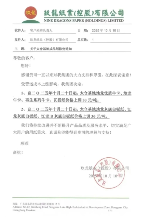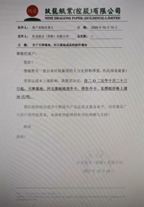 • 玖龍沈陽基地 自十月二十三日起,沈陽基地地龍牛卡、再生牛卡、瓦楞紙價格上調30元/噸。
