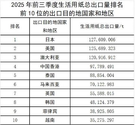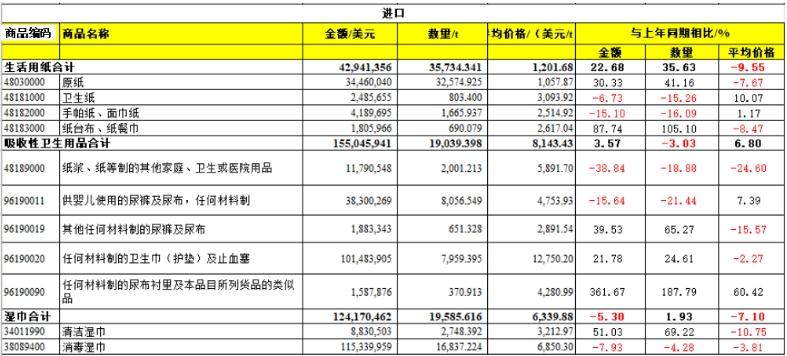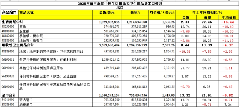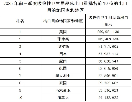 進口 2025年前三季度,生活用紙總進口量比2024年同期增長,但進口量很少,僅有約3.57萬t。進口的生活用紙以原紙為主,占總進口量的91.2%。 吸收性衛(wèi)生用品 2025年前三季度,中國吸收性衛(wèi)生用品出口量持續(xù)增長,進口量則不斷下滑,這主要是由于國內(nèi)吸收性衛(wèi)生用品產(chǎn)能增長、品質(zhì)提升,對進口產(chǎn)品的需求下降。 出口 2025年前三季度,吸收性衛(wèi)生用品的總出口量達128.42萬t,同比增長13.39%,嬰兒紙尿褲在吸收性衛(wèi)生用品出口量中占比最大,占總出口量的43.44%。吸收性衛(wèi)生用品的出口金額達33.10億美元,同比增長8.44%。 女性衛(wèi)生用品、嬰兒紙尿褲、成人失禁用品的出口量均有不同程度的增長,但寵物墊、護理墊等衛(wèi)生用品出口對應(yīng)的商品編碼48189000(紙漿、紙等制的其他家庭、衛(wèi)生或醫(yī)院用品)下的產(chǎn)品出口量同比下降7.59%。分析原因是美國加征關(guān)稅對我國二、三季度出口帶來一定的影響,該編碼下產(chǎn)品出口目的地排名第一的美國的出口量由2024年前三季度的93.095.289t,下降到2025年前三季度的73.015.091t。