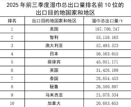 進口 2025年前三季度,中國濕巾總進口量較上年同期增長1.93%,但總量僅為1.96萬t,國內(nèi)市場對進口濕巾需求較少。 注:目前,在海關(guān)的商品編碼中將清潔濕巾歸入34011990.消毒濕巾歸入38089400.但是這兩個編碼下不只是濕巾產(chǎn)品,還包括其他清潔、消毒產(chǎn)品。