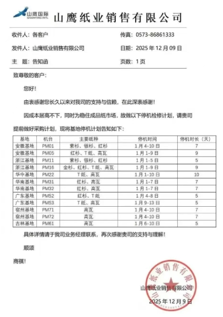 三家龍頭紙企宣布停機計劃,預計2026年初減產約27萬噸包裝紙