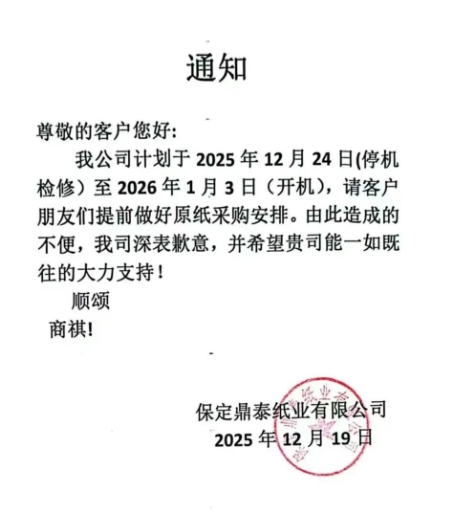 • 保定鼎泰紙業有限公司 我公司計劃于2025年12月24日(停機檢修)至2026年1月3日(開機),請客戶朋友們提前做好原紙采購安排。