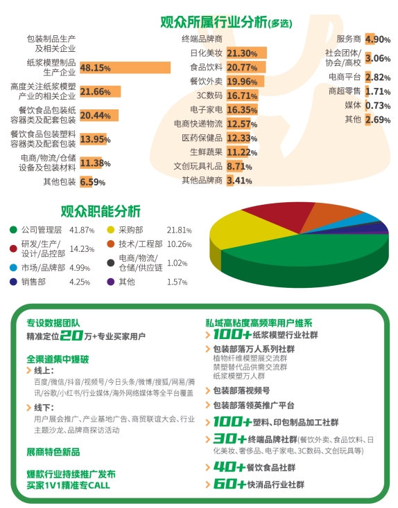 81.9%——IPFM展商平均復展率達81.9% 30%——每屆展會的新參展商數量占比為30% 6/22——展商涵蓋紙漿模塑全產業鏈上中下游6大產業板塊、22細分領域 8000+——截至目前,IPFM總計展示8000+制造加工設備、包裝制品、技術解決方案;1500+新品完成首秀 展會官網:www.ipfmexpo.com 參展申請:https://ecpaklog.mikecrm.com/ICGuj2Z 參觀預登記:https://www.ipfmexpo.com/links/1047 專業直采平臺,80000+觀眾買家到場 在當前全球限塑背景下,紙漿模塑包裝制品成為替塑首選之一各大引領品牌諸如京東、寶潔、蒙牛、伊利、來伊份、愛立信、DIOR、星巴克、西貝、騰訊等都換用紙漿模塑包裝,紙漿模塑產業得到了日化美妝、食品飲料、餐飲烘培、咖啡茶飲、3C電子電器、電商零售、文創禮品、日用百貨等多領域終端品牌商的高度關注,品牌商迫切希望得到行業信息交流、集中一站式采購等方面的專業服務。IPFM應市場之需,應終端品牌商之需,為終端品牌商提供無憂直采服務,彰顯平臺價值。 IPFM2026預計將吸引80.000+國內外專業觀眾買家到場,涵蓋—— 紙漿模塑包裝制品生產商:包含餐包、工包、精包、蛋托、果托等領域 紙漿模塑用品生產商:包含園藝、醫療機械、鞋托、文化教育、建材裝飾等領域 高度關注紙漿模塑產業的相關包裝企業:造紙企業、紙板紙箱廠、紙包裝企業、塑料包裝企業、其它材質包裝容器制造商等 終端品牌商:包含餐飲外賣、方便預制食品、生鮮蔬果、農產品、日化美妝、奢侈品、電子家電、工業品、電商快遞物流、醫療衛生、建材家居、園藝寵物、文創玩具等領域 相關行業服務供應商:金融租賃、行業咨詢、設計營銷
