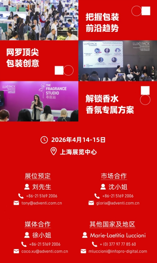 關(guān)于LUXE PACK 在過(guò)去近40年的光輝歷程中,LUXE PACK國(guó)際奢侈品包裝展順應(yīng)并引領(lǐng)市場(chǎng)發(fā)展趨勢(shì),已在全球包裝行業(yè)內(nèi)樹(shù)立了卓越標(biāo)桿,并通過(guò)在摩納哥、巴黎、紐約及洛杉磯等地成功舉辦的系列展覽,贏得了國(guó)際高端市場(chǎng)的廣泛的認(rèn)可與贊譽(yù)。而在上海舉辦的國(guó)際奢侈品包裝展則為亞洲市場(chǎng)成功搭建起了一座連接本土企業(yè)與國(guó)際市場(chǎng)的溝通與合作橋梁。