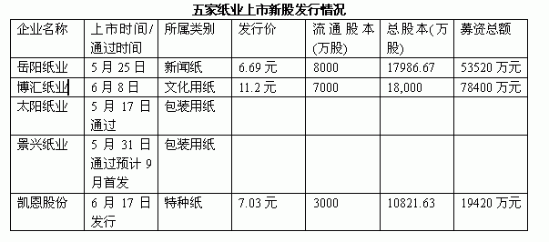 截止到6月30日,2004年上半年共有五家造紙企業(yè)通過發(fā)審會審核或首次公開發(fā)行股票,他們是岳陽紙業(yè)、博匯紙業(yè),太陽紙業(yè)、景興紙業(yè)、凱恩股份。其中,新聞紙行業(yè)一家,文化用紙一家,包裝用紙二家,特種紙一家。岳陽紙業(yè)已經(jīng)于5月25日上市,博匯紙業(yè)于6月8日上市。太陽紙業(yè)于5月17日經(jīng)發(fā)審會審核通過、景興紙業(yè)5月31日通過發(fā)審會審核,預計9月首發(fā)。凱恩股份是中小企業(yè)板第12家公司,于6月17日發(fā)行3000萬股A股。