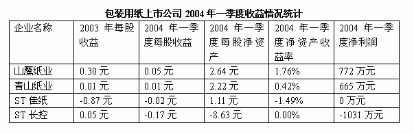 包裝用紙上市公司共有四家,隨著國內(nèi)市場需求消費趨旺,包裝紙市場需求一直保持增長,并有加速態(tài)勢。但包裝用紙上市公司并沒有跟進市場,山鷹紙業(yè)生產(chǎn)經(jīng)營繼續(xù)保持穩(wěn)定增長,效益明顯,一季度實現(xiàn)凈利潤771.6萬元,比去年同期增長30%。其他三家企業(yè)今年一季度仍繼續(xù)低迷,ST佳紙、ST長控兩家公司因為原燃材料價格上漲,燃煤供應(yīng)緊張,以及企業(yè)本身遇到的一些問題,影響正常生產(chǎn),繼續(xù)虧損,形勢嚴峻。青山紙業(yè)雖然克服這些困難,生產(chǎn)和銷售實現(xiàn)增長,一季度凈利潤6,647,975.26元,同比增長35.14%,但每股收益僅為0.01元。