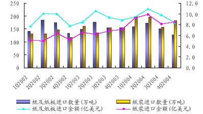 4、設備:人民幣升值可以減少造紙設備的進口成本。由于我國造紙企業設備落后,無法滿足高檔紙生產的工藝要求,近年來大量引進國外生產線,2004年我國進口造紙設備用匯量達13.88億美元。人民幣升值將減少造紙設備的進口成本,從而減少生產成本和財務費用,提高企業的盈利能力。