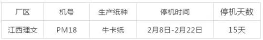 2021年1月6日,江西理文造紙有限公司發(fā)布通知稱(chēng),因生產(chǎn)機(jī)器設(shè)備需進(jìn)行停機(jī)檢修,生產(chǎn)?埖腜M18紙機(jī)計(jì)劃在2021年2月8日-2月22日期間停機(jī)15天。