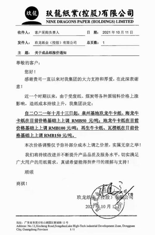 自2021年10月13日起,泉州基地玖龍牛卡紙、海龍牛卡紙在目前價格基礎上上調50元/噸,地龍牛卡紙在目前價格基礎上上調100元/噸,再生牛卡紙、瓦楞紙在目前價格基礎上上調150元/噸。