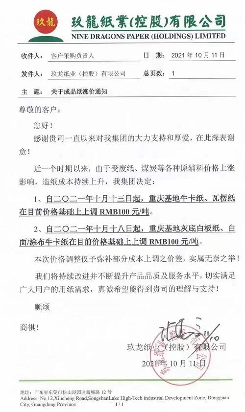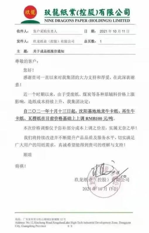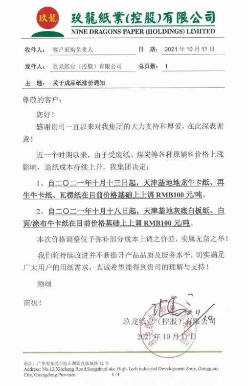 自2021年10月13日起,太倉基地地龍牛卡紙、再生牛卡紙、100克(含)以下瓦楞紙在目前價格基礎上上調100元/噸,100克以上瓦楞紙在目前價格基礎上上漲150元/噸。