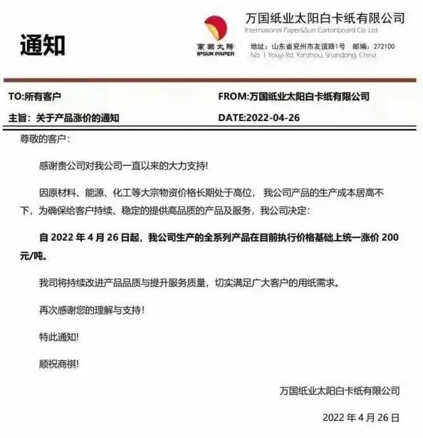 萬國太陽:自4月26日起,我公司生產(chǎn)的全系列產(chǎn)品在目前執(zhí)行價格基礎(chǔ)上統(tǒng)一漲價200元/噸。